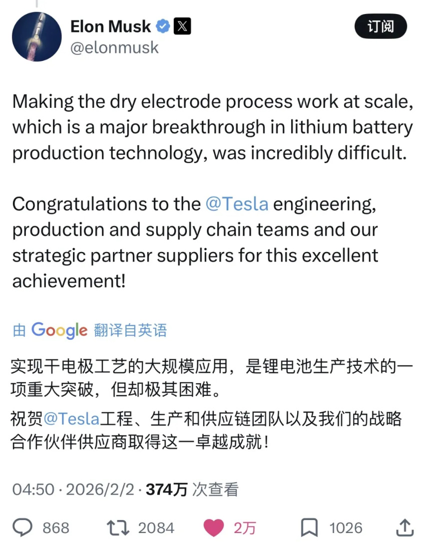 就在近期,马斯克与特斯拉官方带来了重磅消息:4680电池最难啃的“干法正极工艺”已经取得了重大突破,实现了规模化量产,并已顺利搭载在部分Model Y车型上。