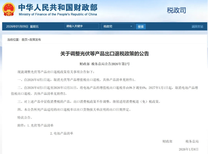 尤其是结合宏观政策来看:根据财政部最新消息,自2026年4月1日起,电池产品增值税出口退税率将由9%下调至6%,并将在2027年全面取消。